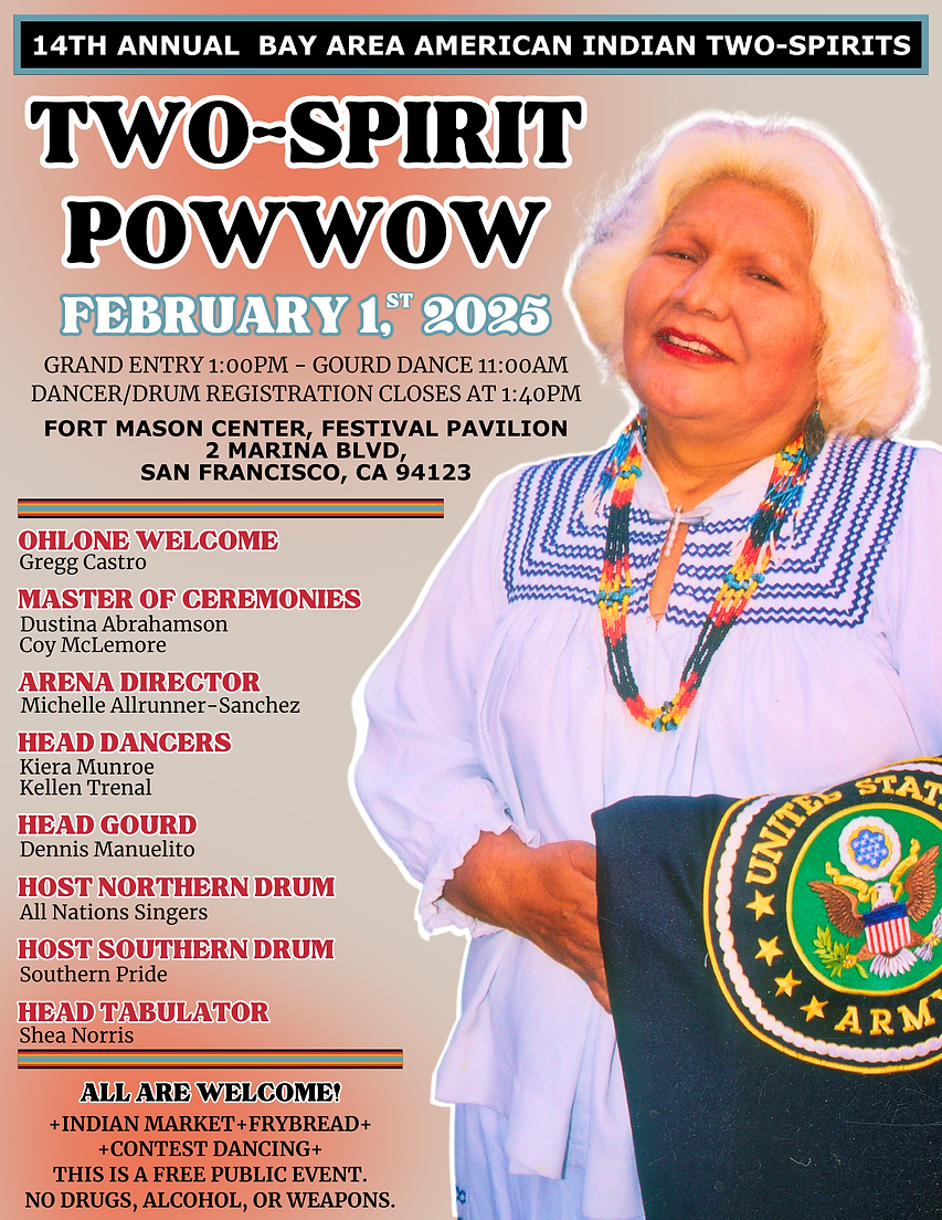 /All are welcome to join the Indigenous two-spirits community for the annual “Bay Area American Indian Two-Spirit (BAAITS) Powwow” at Fort Mason Center for Arts & Culture (FMCAC) on Yelamu Ramaytush Ohlone Lands. The “Two-Spirit Powwow” celebrates traditional Indigenous culture and also provides a gender-affirming experience for the diverse two-spirits community, the LGBTQ+ community, and allies. The 2025 event takes place in FMCAC’s Festival Pavilion on Saturday, February 1, 2025, from 11:00 a.m. to 6:30 p.m.