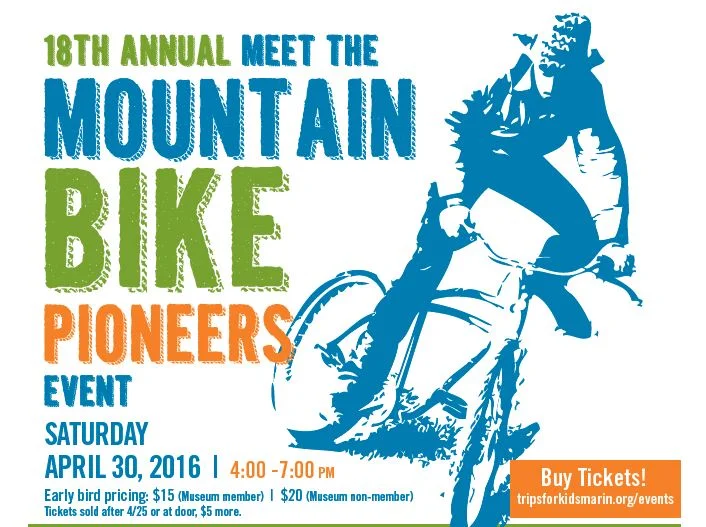 Don't miss Trips for Kids' 18th Annual Meet the Pioneers Event on Saturday, April 30th. Meet the creators and pioneers of this terrific sport like Joe Breeze, Otis Guy, Marc Vendetti, Gary Fisher, Juliana Furtado, Steve Potts, Mert Lawwill, Tom Ritchey, Denise Caramangno, Chris Chance, Ross Shafer, Mark Slate, Donald Koski, Jacqui Phalen, Marilyn Price, and see the history displayed at the Marin Museum of Bicycling and Mountain Bike Hall of Fame in Fairfax. Because it's the kids on the trails today that will be tomorrows legends.