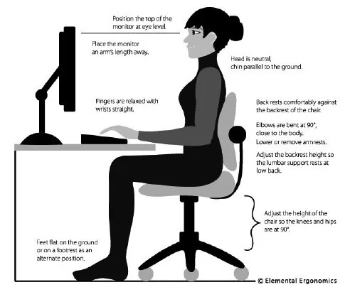 Appropriate height desk, have a height adjustable chair and footrest. Sit all the way back in the chair with good back support, keep chair closer to desk, keyboard and mouse needs to be at elbow height. Monitor at eye level. If keyboard and mouse are too high on the desk, raise the chair, so that keyboard is at elbow height. If feet are dangling after raising the chair use the footrest. The top of the monitor needs to be at eye level. When you look at the monitor, keeping head in neutral alignment, your focal point should be within upper 1/3rd quadrant of screen. Use peripherals like a keyboard and mouse which should stay at the edge of the desk.