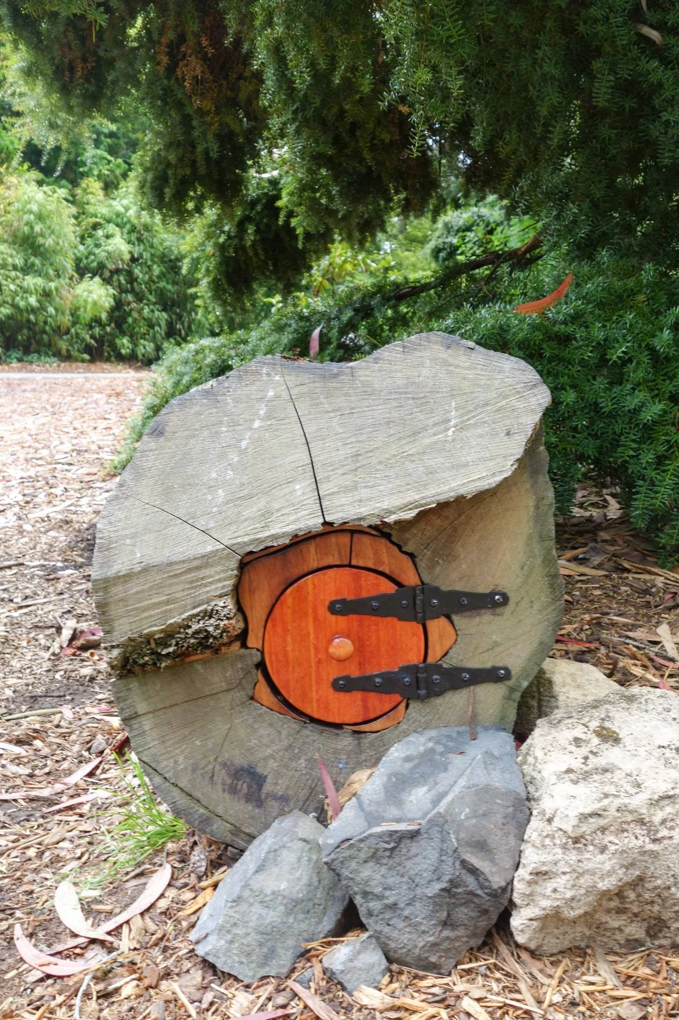 This little fairy likes to make it a little more challenging for you to find. Locate the paved pathway that runs along the outside of the Japanese Tea Gardens on the Stowe Lake side, walk up the paved pathway for about 100 feet until you see a fallen eucalyptus log (approximately 18 feet long) that is broken in two. It will be on the left side of the path. At the end of this log is the fairy door!