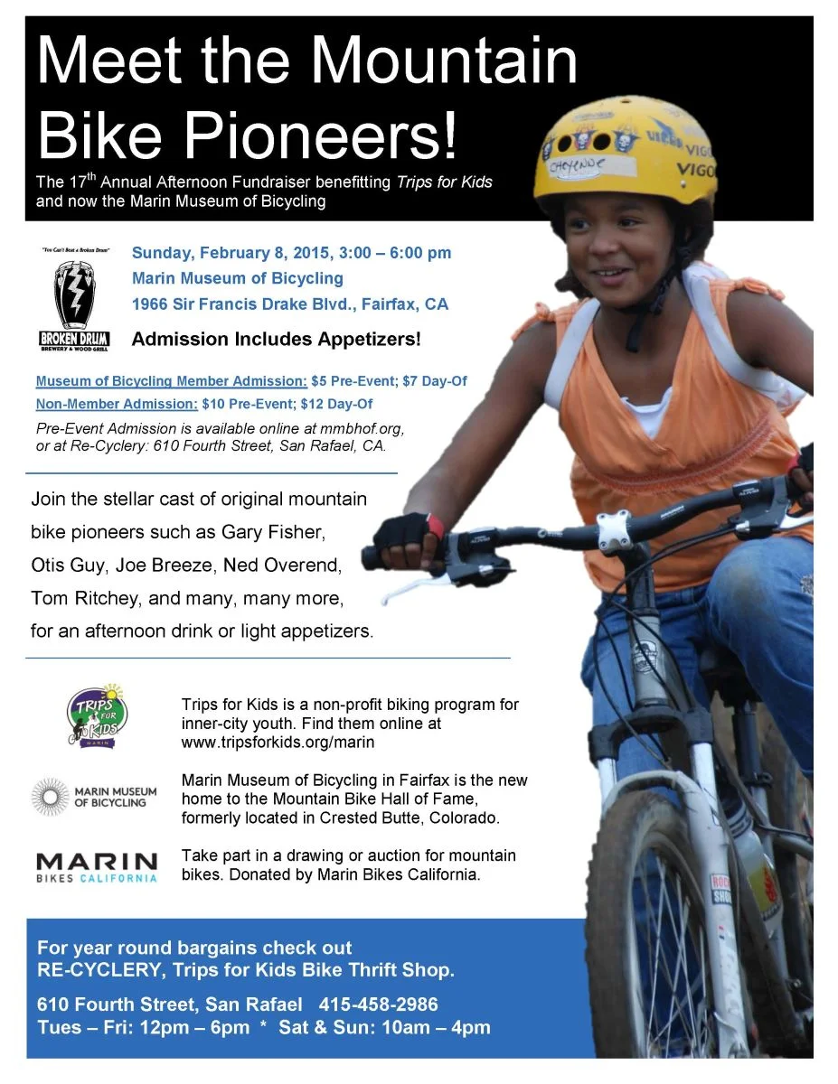 One of the top family-friendly events this weekend is the Fundraiser for Trips for Kids on Sunday, February 8th from 3-6pm at the Marin Museum of Bicycling, 1966 Sir Francis Drake Blvd. Fairfax. Meet mountain bike legends Gary Fisher, Joe Breeze, Ned Overend, Tom Ritchey, Scot Nicol, Juli Furtado, Otis Guy, Charlie Kelly, Ross Shafer, Steve Potts, Chris Chance, Mert Lawwill, Rick Sutton, Mark Slate, Maurice Tierney and Dave Garoutte. Hope to see you there to support Trips for Kids!