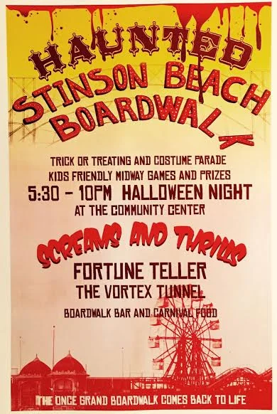 Haunted Stinson Beach Boardwalk, October 31st ONLY, 5:30-10p, fortune teller, vortex tunnel, costume parade, games, trick or treating and more! Stinson Beach Community Center.