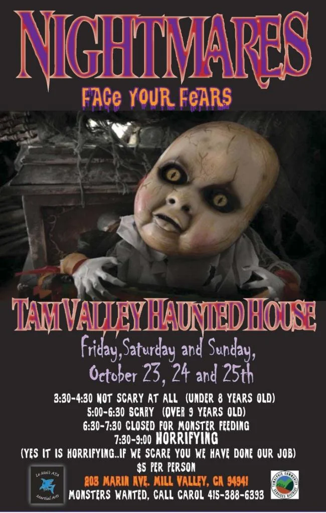 Tam Valley Haunted House, Nightmares, Face Your Fears, open October 23, 24, and 25th, 3:30-4:30pm Not scary for under 8, 5-6:30pm Scary Over 9, 7:30-9pm HORRIFYING, 203 Marin Avenue, Mill Valley.