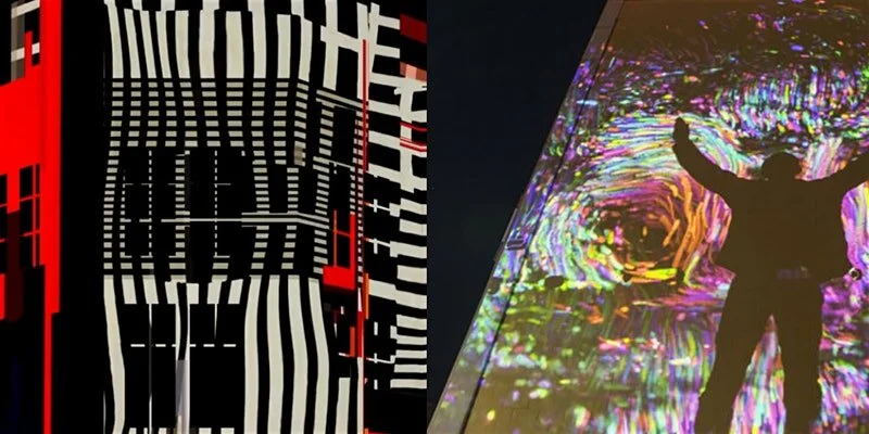 The installation Lightforms consists of 5 sculptures. Trillian is a 10 foot-tall rhombicosidodecahedron, features a combination of 62 triangular, square and pentagonal faces. All sculptures are illuminated from within with colored LED lights that produce intricate patterns on the ground surrounding the works.