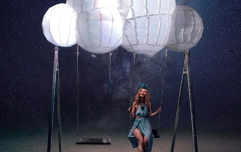 Cloud Swing suspends seats from glowing cloud structures, in which color and light are created as people engage with the artwork and swing through the air.