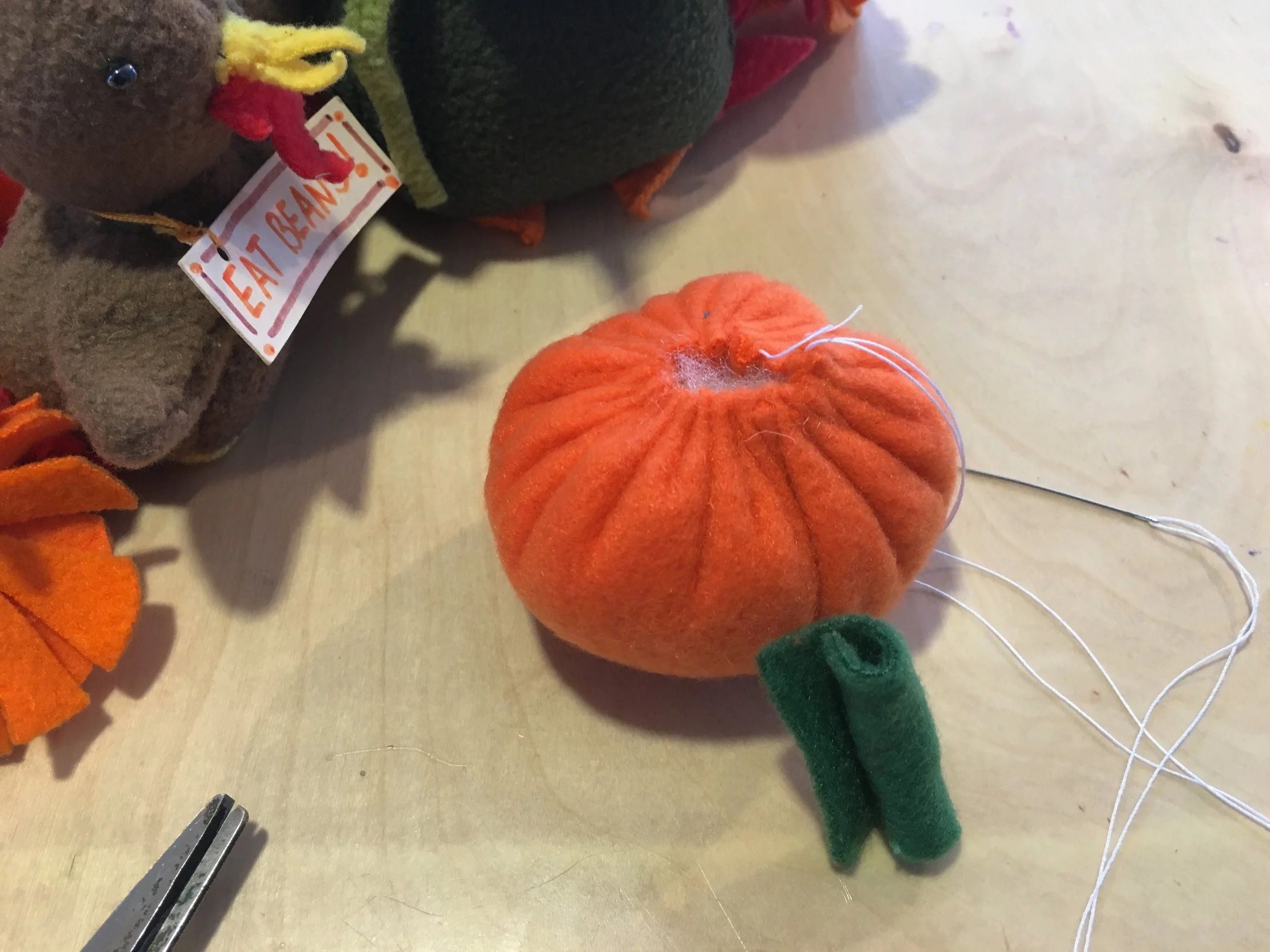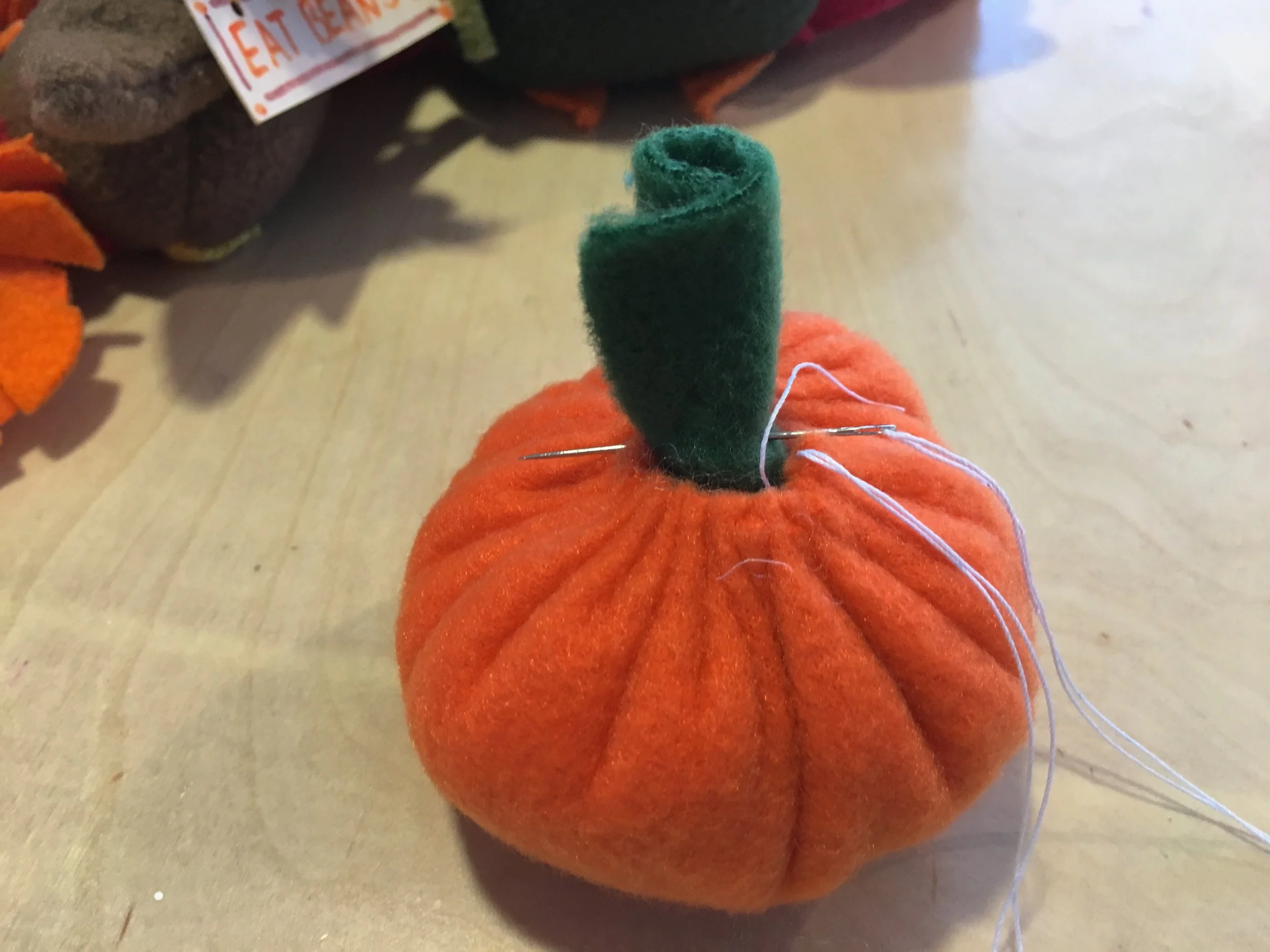 5. Insert the stem in the hole of the pumpkin and do some stitches going through the stem and the pumpkin, until itβs attached tightly.