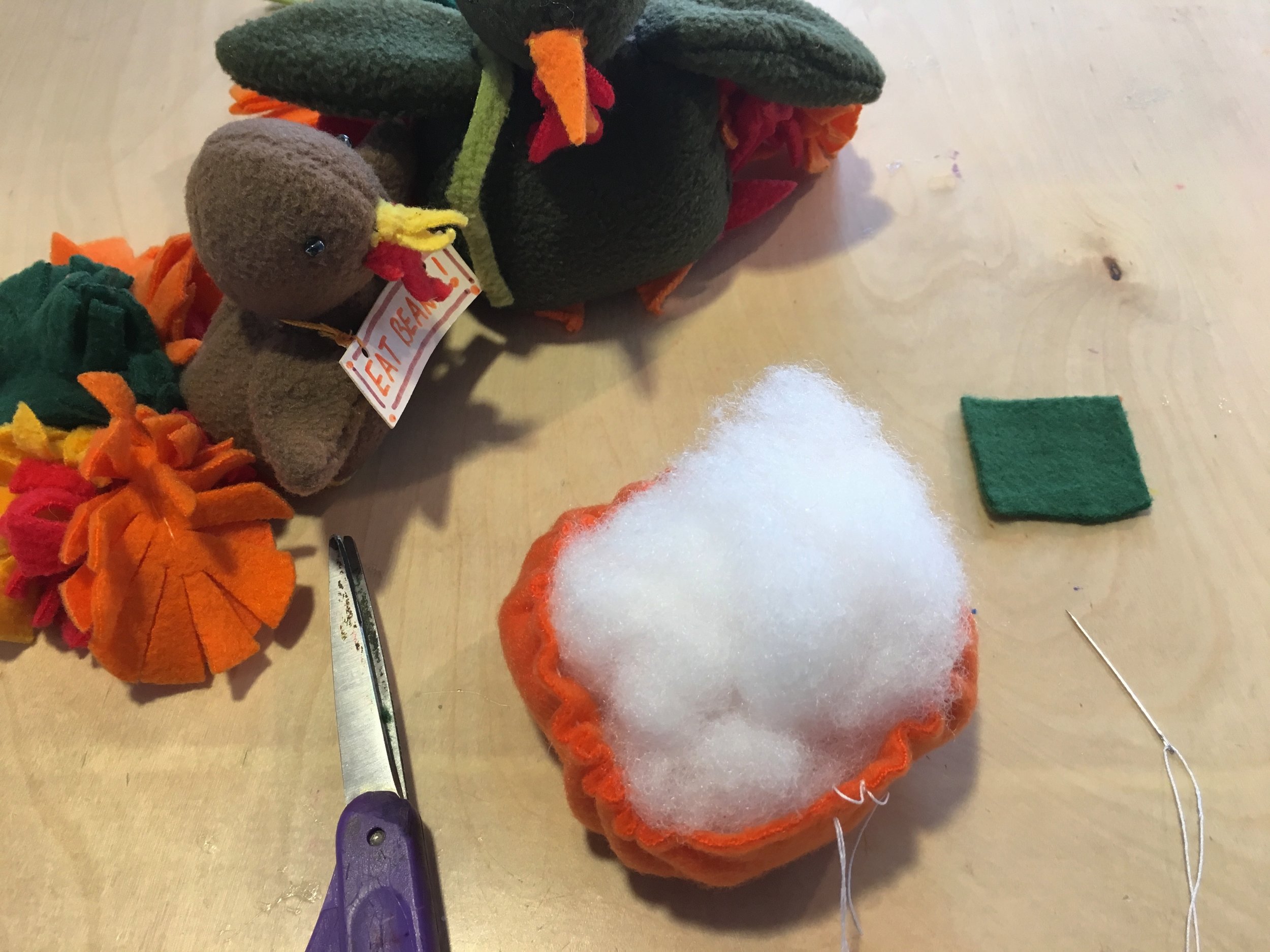 3. Pull on your thread so the circle becomes a cup. Put the stuffing in it and pull your string tight until the cup is almost closed.