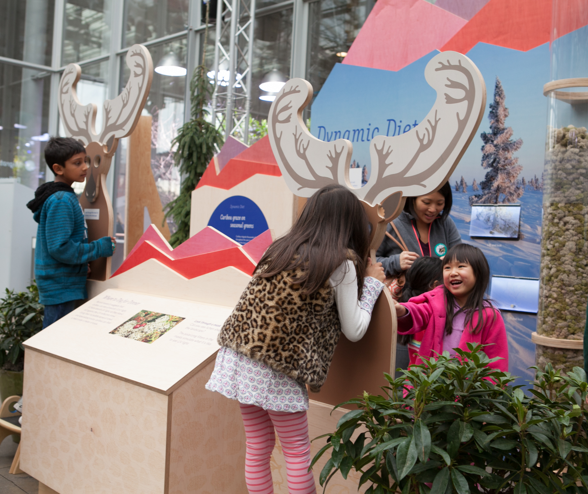 Interactive displays that highlight the amazing adaptations of reindeer and invite visitors to see an animation of antler growth, feel how reindeer fur insulates against cold, spin zoetropes illustrating reindeer in motion, experience a simulation of reindeer vision, and trace a reindeer migration route.