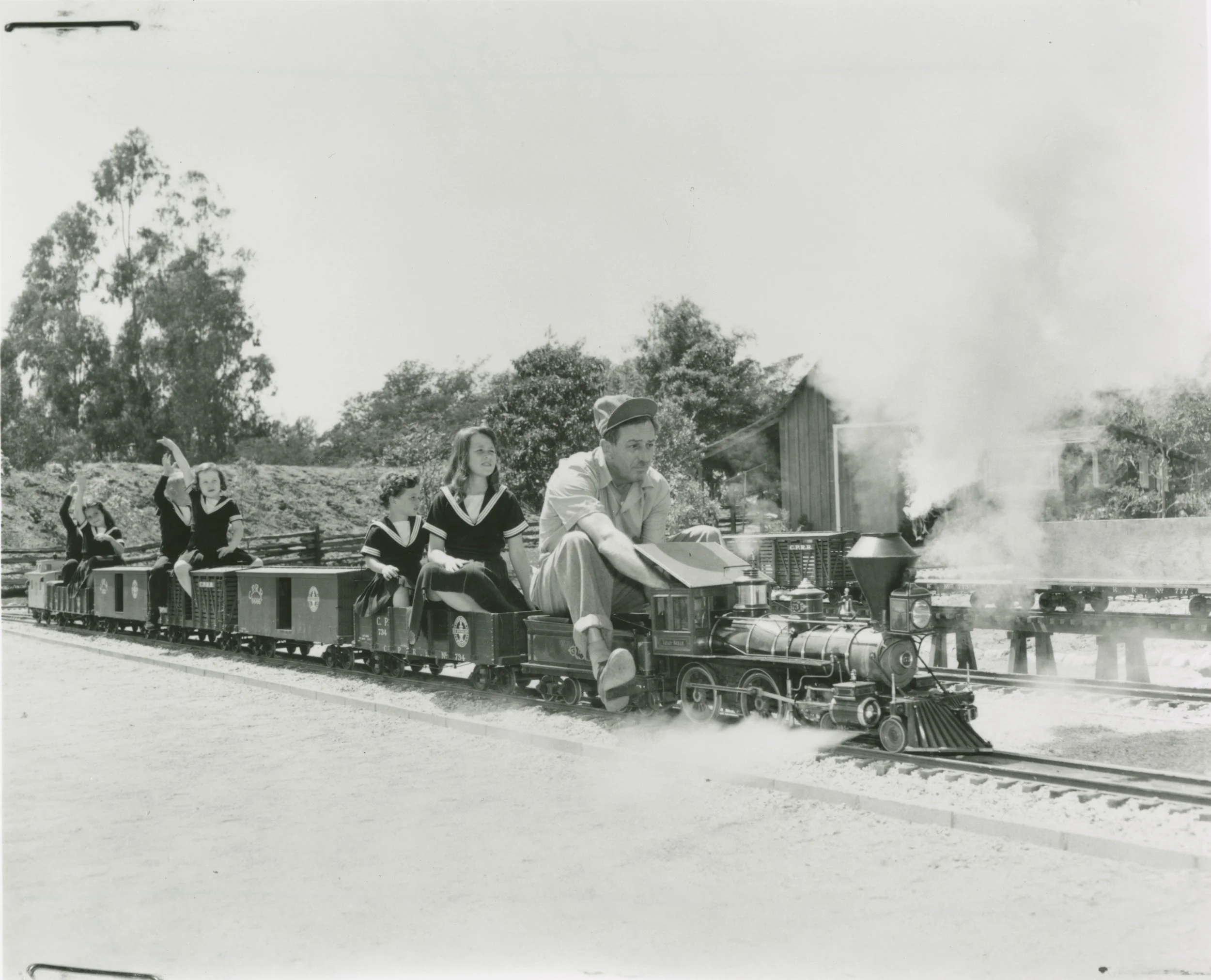 The installation includes an elaborate three-dimensional model of the Disney Family home on Carolwood Drive in Holmby Hills, Los Angeles—featuring Walt’s personal steam locomotive, the Lilly Belle, chugging along his Carolwood Pacific Fair Weather Route.