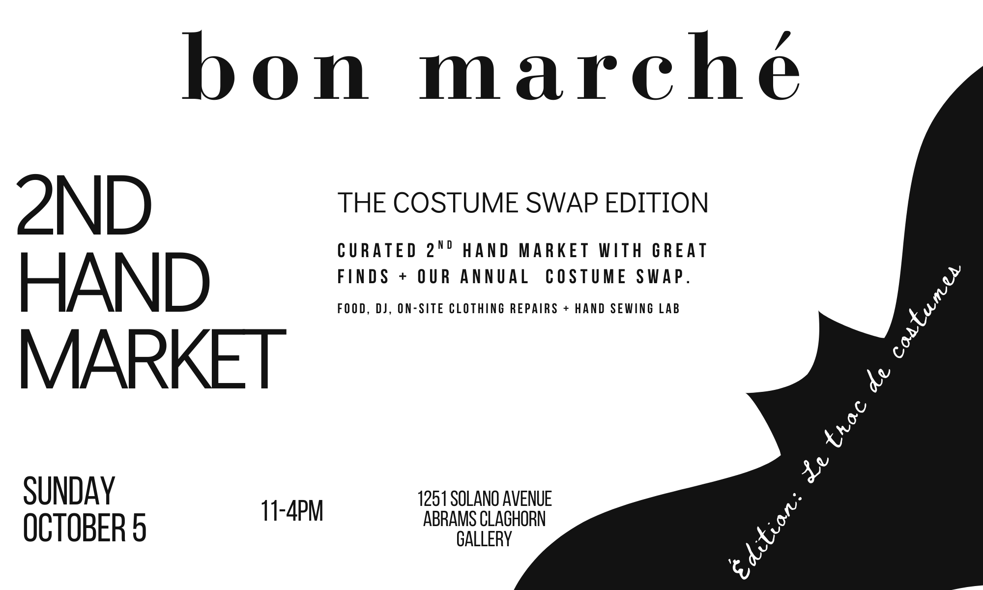 Join us for the fall edition of Bon Marché: Édition Le Troc de Costumes (THE costume swap!), co-hosted with Abrams Claghorn Gallery. Expect curated 2nd-hand finds, creative repair + reuse activities, a costume swap, food, music, and community.