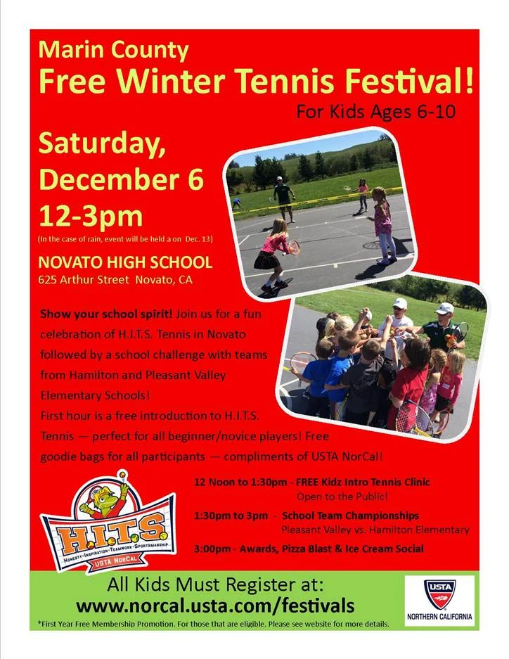 Winter Tennis Festival, 12-3pm, ages 6-10, free, Kidz Tennis Clinic featuring H.I.T.S. Tennis. Ideal for beginner/novice players, Pizza, Ice Cream and goodies for all, rain date will December 13, 625 Arthur Street, Novato High School.
