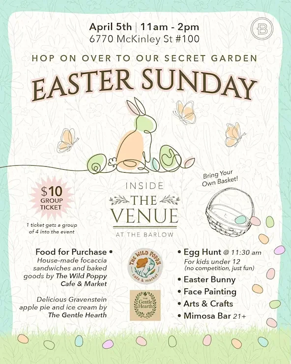 Your $10 ticket is valid for a family/group of 4 (kids under 2 years old are free). Spend the afternoon with us on the lawn, hunting for eggs, sipping mimosas, and having a delicious lunch from Wild Poppy Cafe.