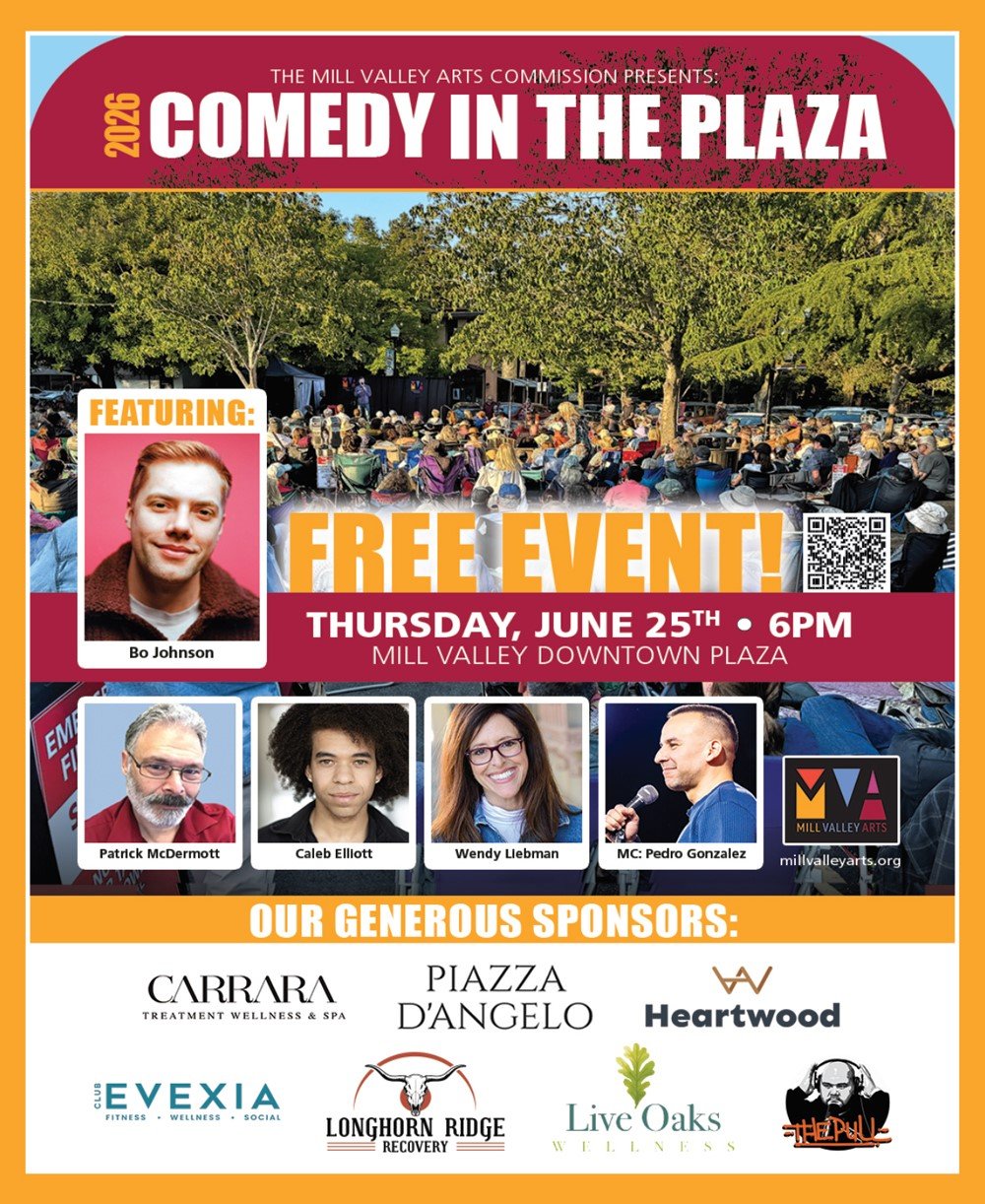 The Mill Valley Arts Commission's Comedy in the Plaza returns for 2026 on Thursday, June 25th at the Mill Valley Downtown Plaza!