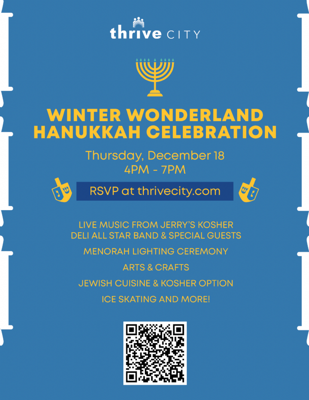 Celebrate the Festival of Lights with us at Thrive City's Winter Wonderland Hanukkah Celebration! Join us for a memorable evening as we light the menorah followed by live entertainment including music from Jerry’s Kosher Deli All Star Band, festive treats, and arts & crafts. Ice skating will also be open on a first-come, first-served basis, pending on weather conditions.