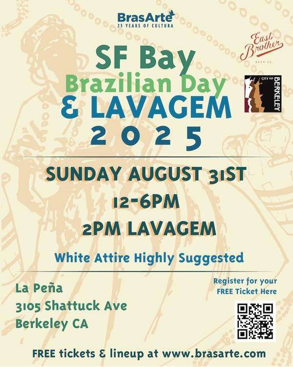 In honor of the communities that created this tradition, BrasArte holds an homage to this festival in Berkeley every year. Labor Day weekend we close the street and hold our annual SF Bay Brazilian Day & Lavagem Festival. A procession takes place ending in a cleansing and renewal ceremony for our community center the Casa de Cultura. This is followed by a full program of music and dance with typical foods and arts and crafts.
