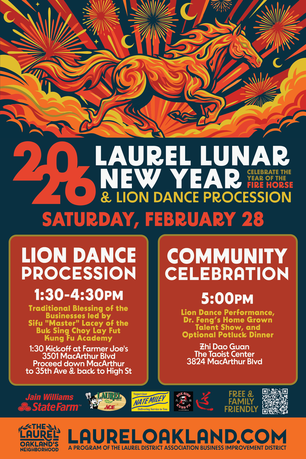 1:30-4:30pm: Join us for the procession! Starting from the Farmer Joe’s parking lot (3501 MacArthur Blvd.) the Lion Dance procession visits businesses along MacArthur Boulevard from 35th Avenue to High Street in Oakland's Laurel District. Free and family-friendly!