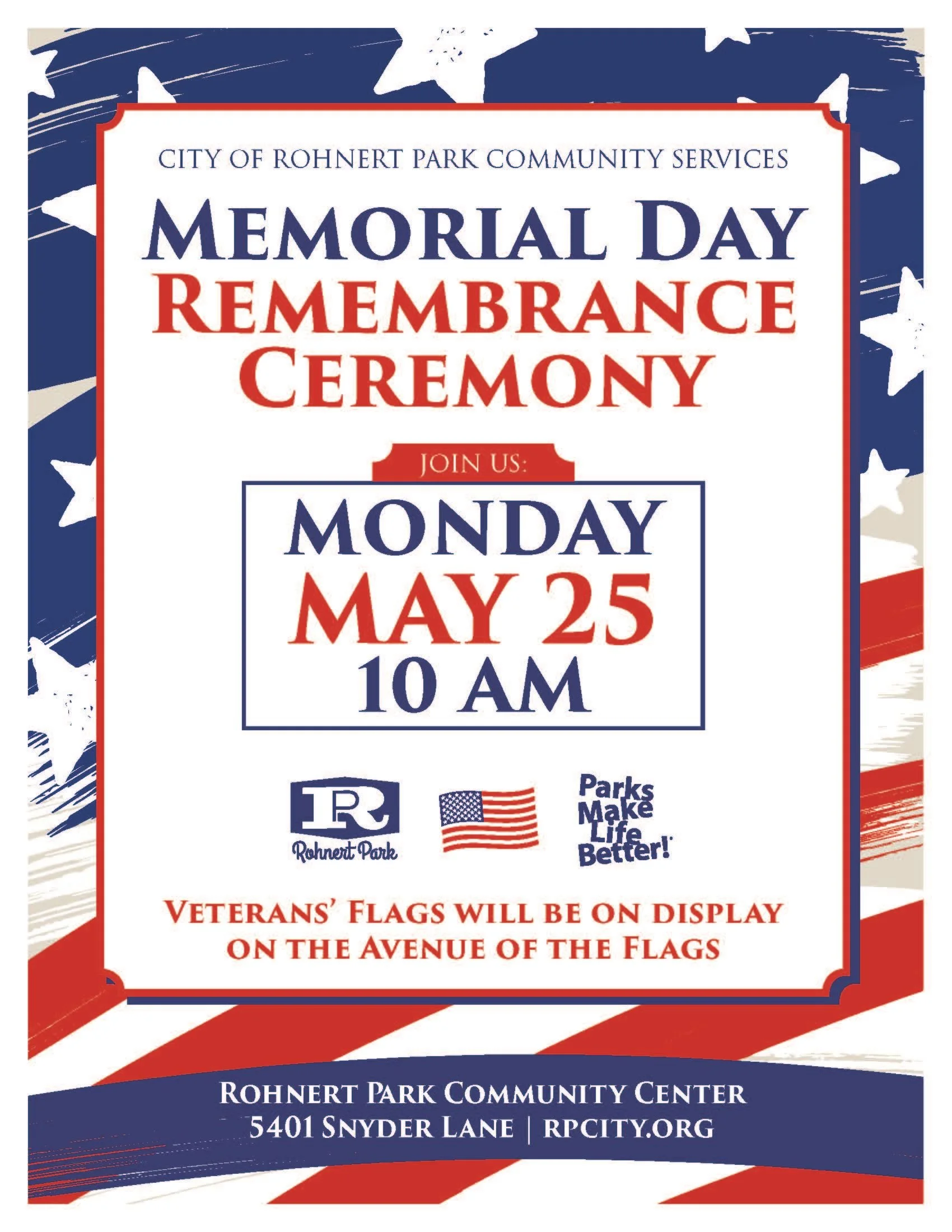 The City of Rohnert Park is proud to announce its collaboration with the American Legion to host a special Memorial Day Remembrance Ceremony event on Monday, May 25, 2026. The ceremony will take place at 10 am at the Rohnert Park Community Center, located at 5401 Snyder Lane.