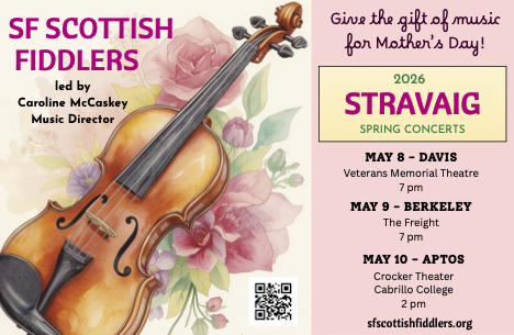 SF Scottish Fiddlers Stravaig Spring Concerts. Music Director Caroline McCaskey promises a musical journey like no other! Over 65 musicians on fiddles, cellos, piano, drums, and guitars deliver a spirited performance—ranging from high-energy dance tunes to soulful, romantic melodies.