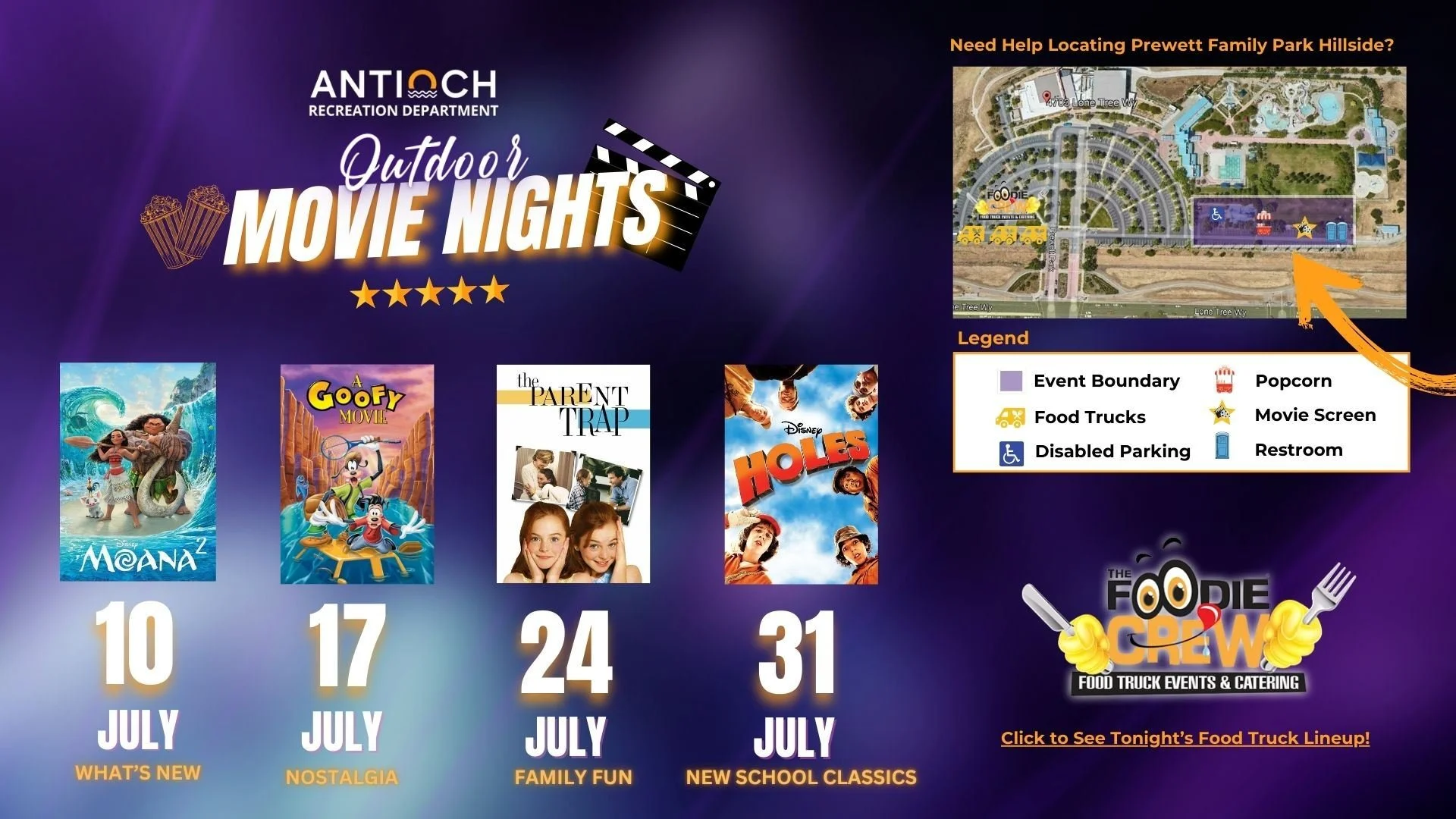 Grab your blankets and lawn chairs, and bring the entire family out to enjoy popcorn, kids' crafts and a movie. Happening on the Prewett Family Park Hillside, next to the Antioch Water Park, movies will begin just after dusk (approximately 8:30 pm to 8:45 pm depending on sunset). Did we mention it will also be Food Truck Thursday, brought to you by FoodieCrewSF? Don't forget to grab dinner before the movie begins! You won't want to miss this.