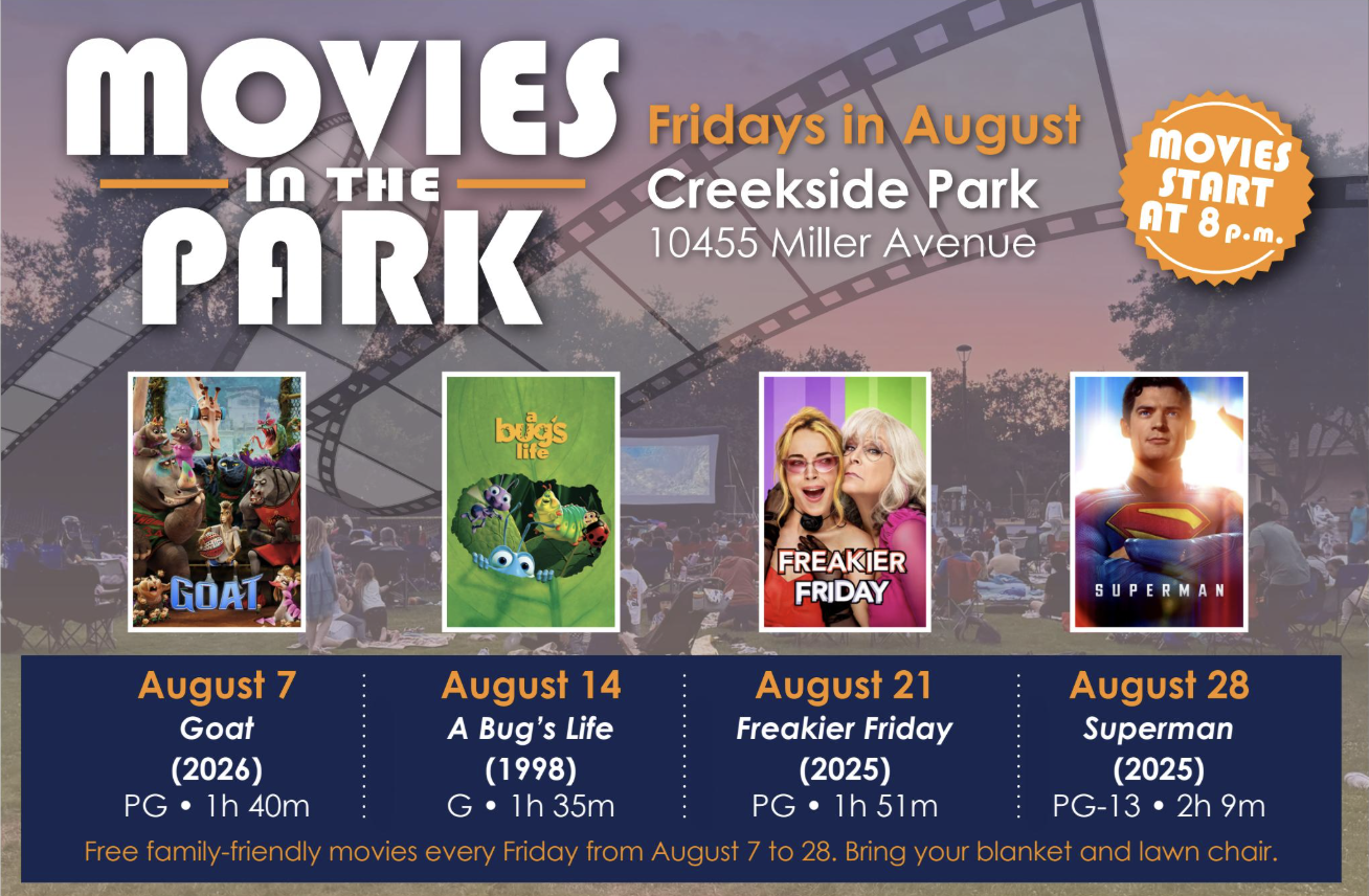 Movie Magic Under the Stars! Join Cupertino Parks and Recreation this summer for Movies in the Park, a free outdoor film series at beautiful Creekside Park. Every Friday evening, the community gathers to enjoy a fun lineup of films on a giant outdoor screen—from the latest blockbusters to modern hits and timeless classics. Bring your blankets, lawn chairs, and loved ones for a night of entertainment, connection, and summer vibes under the stars.