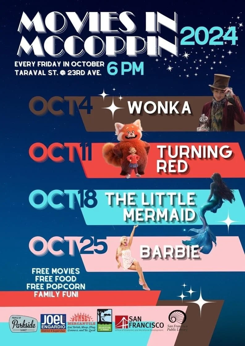 Join POPS this October for the annual Movies in McCoppin event—a month of free, family-friendly fun under the stars! Every Friday night, McCoppin Square Playground will transform into an outdoor movie theater where you can enjoy popular films with your loved ones. Bring your family, friends, and neighbors for an unforgettable evening filled with laughter, entertainment, and community spirit.