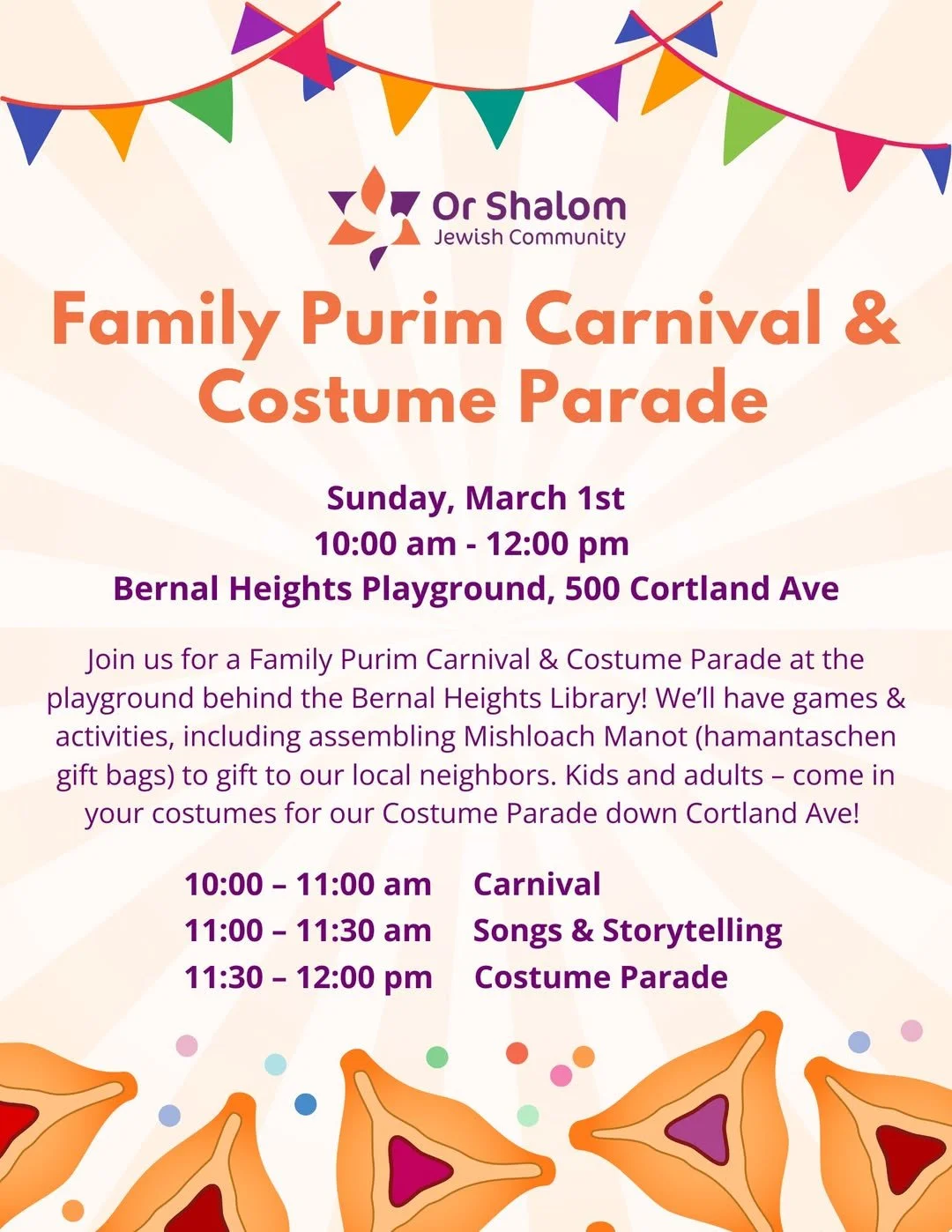 Join us the day before Purim for a Family Purim Carnival & Costume Parade at Bernal Heights playground and recreation center behind the Bernal Heights Library! There will be carnival games and activities including assembling Mishloach Manot (hamantaschen gift bags) to gift to our local neighbors. Kids and adults alike, come in your costumes for our Costume Parade down Cortland Ave! No registration is necessary to attend!