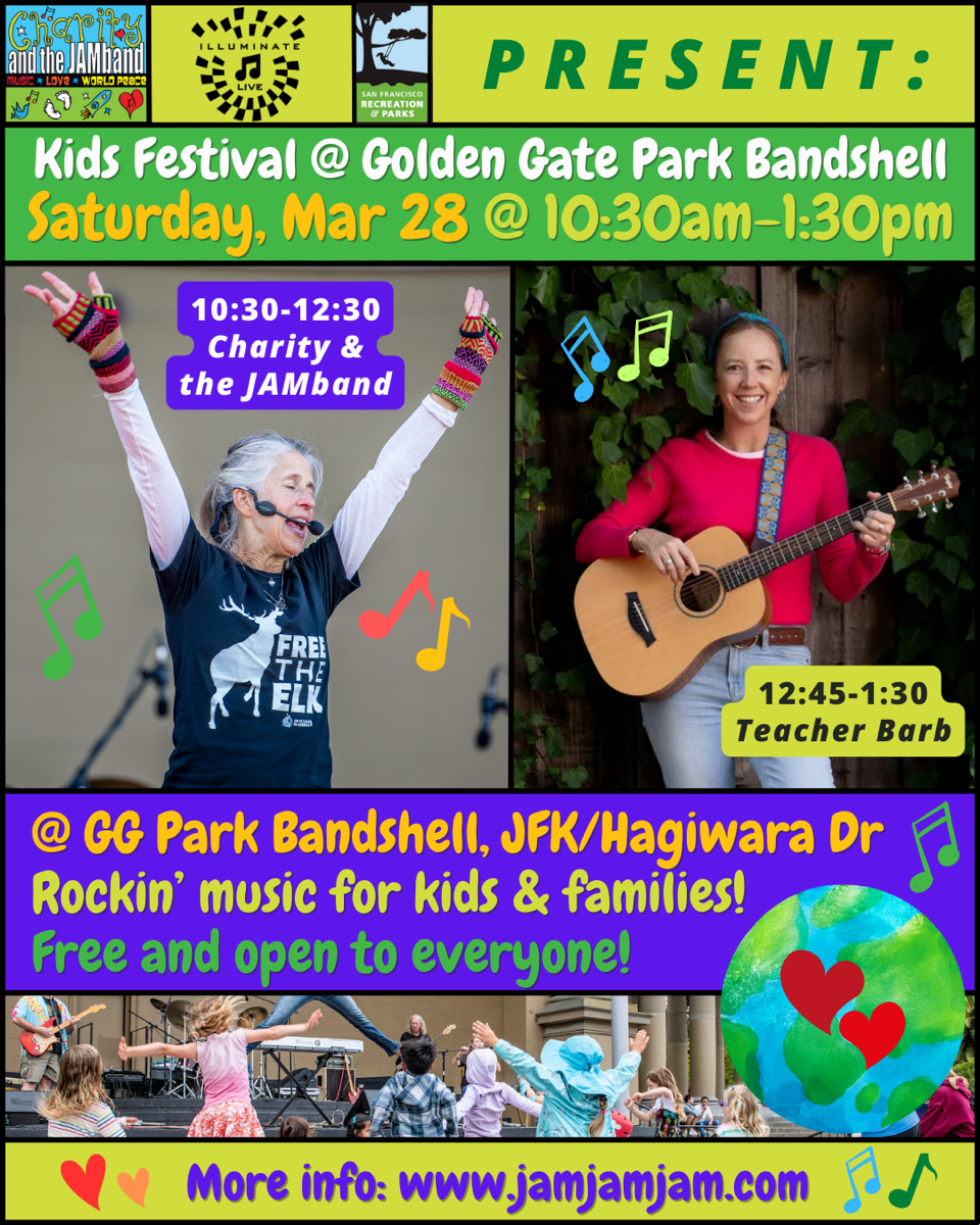 Charity and the JAMBand is back for the 5th Annual Kids Festival at the Golden Gate Bandshell. Joined by Teacher Barb, this show is an event your family won’t want to miss!