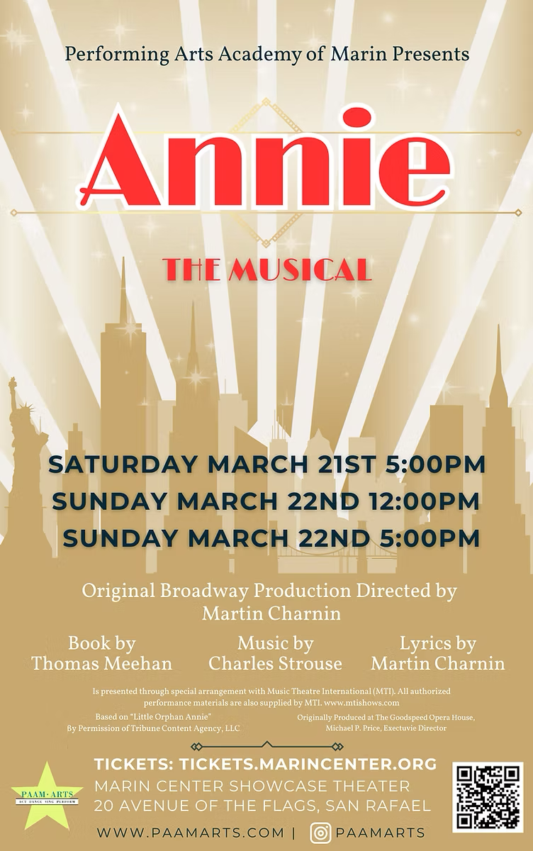 Performing Arts Academy of Marin is delighted to present the beloved musical Annie! With the book and score by Thomas Meehan, Charles Strouse, and Martin Charnin, this Tony Award winning show brings friendship, adventure, and family to the stage. Directed and choreographed by PAAM’s own Matthew McCoy, with featured choreography by CEO & Artistic Director Annie Leese.