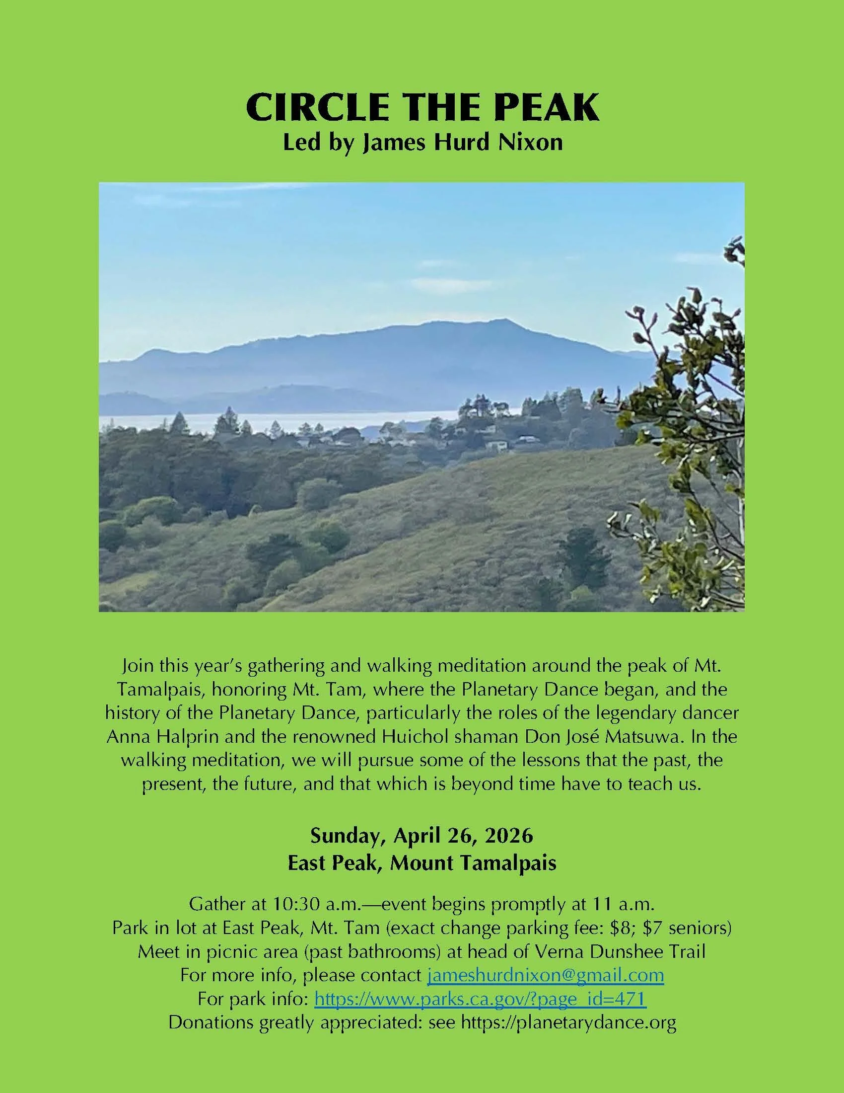 Join this year's gathering and walking meditation around the peak of Mt. Tamalpais, honoring Mt. Tam, where the Planetary Dance began, and the history of the Planetary Dance, particularly the roles of the legendary dancer Anna Halprin and the renowned Huichol shaman Don José Matsuwa. In the walking meditation, we will pursue some of the lessons that the past, the present, the future, and that which is beyond time have to teach us.