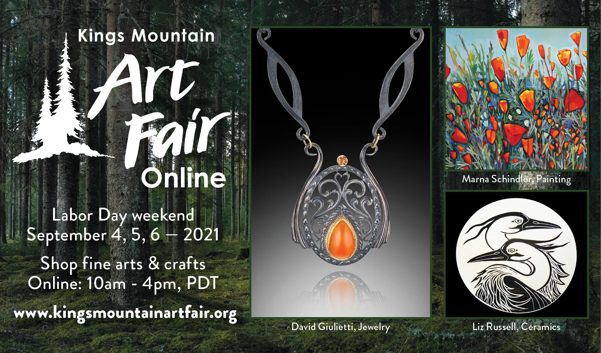 Join the Kings Mountain Art Fair, online on Labor Day weekend 2021! The fair offers fine arts and crafts by independent artists, selected through a jury process. You are invited to live chat with artists and shop their websites for extraordinary art. Join this experience by registering now or visit Labor Day Weekend. www.kingsmountainartfair.org. Proceeds support the Kings Mountain Volunteer Fire Brigade and the Kings Mountain Elementary School. The Fair is run 100% by local volunteers.