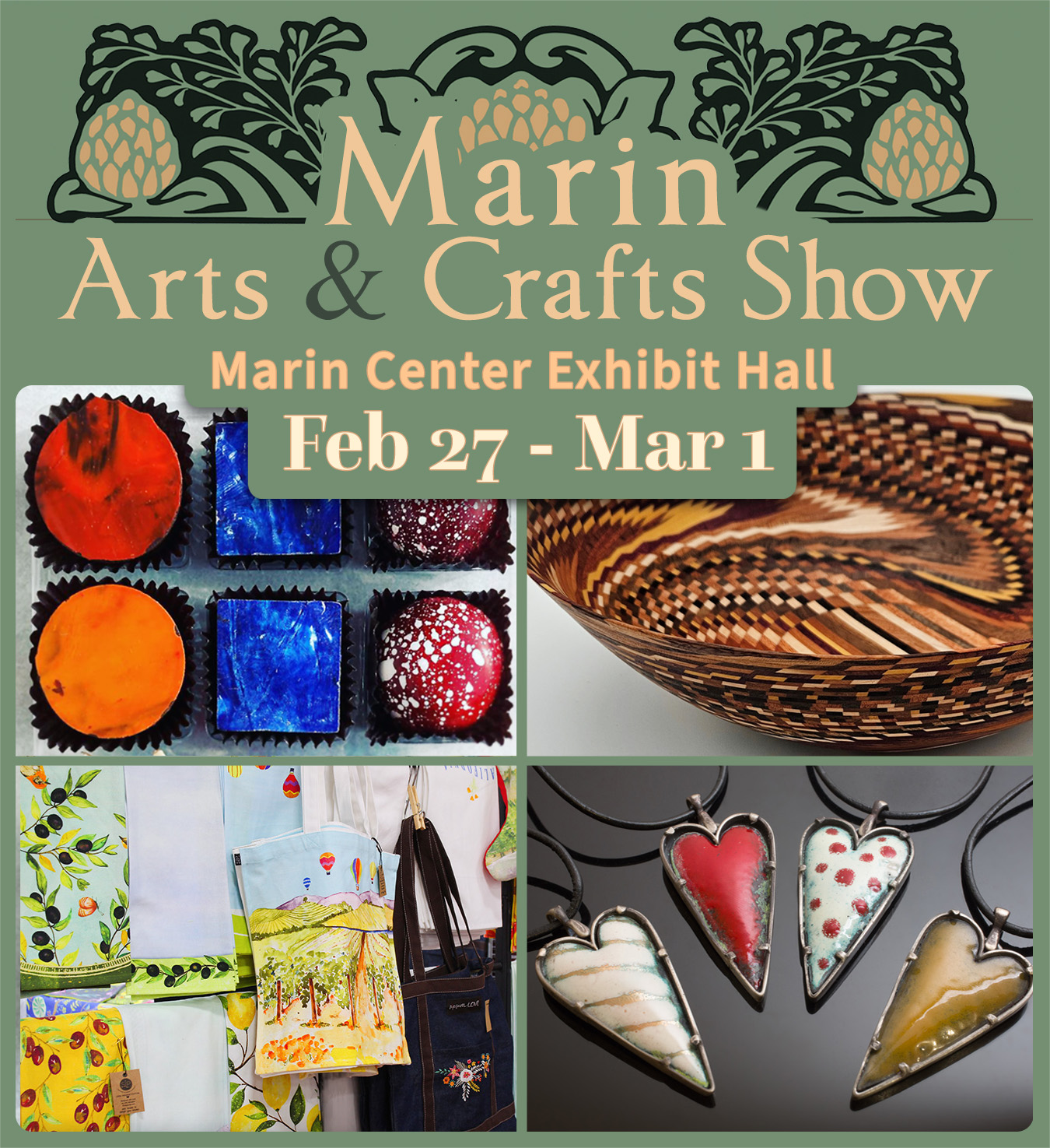 Inspired by the Arts & Crafts movement, the Marin Arts & Crafts Show highlights handcraft, thoughtful design, and traditional techniques. More than 200 artisans present a wide range of work, including jewelry, ceramics, textiles, woodwork, fine art, furniture, decorative objects, and artisan foods.