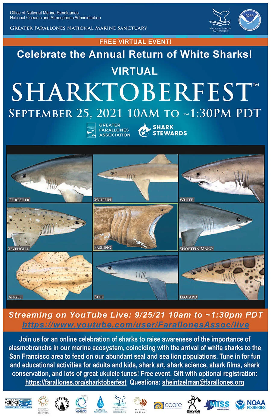 JOIN US, Greater Farallones National Marine Sanctuary, Shark Stewards, and partners to raise awareness of the importance of elasmobranchs in our marine ecosystem, coinciding with the arrival of white sharks to the San Francisco area to feed on our abundant seal and sea lion populations. Tune in for fun and educational activities for adults and kids, shark art, shark science, shark films, shark conservation, and lots of great ukulele tunes!