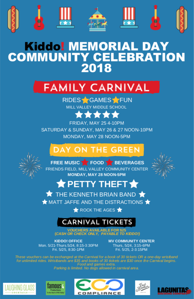 Carnival hours will be Friday, May 25, 4 to 10 pm; Saturday and Sunday May 26 and 27, noon to 10 pm; and Monday, May 28, noon to 5 pm. The Day on the Green will feature free music – and food and beverages for purchase – on Monday, May 28 after the Mill Valley Memorial Day Parade is over. Drop all your troubles by the riverside and come on by!