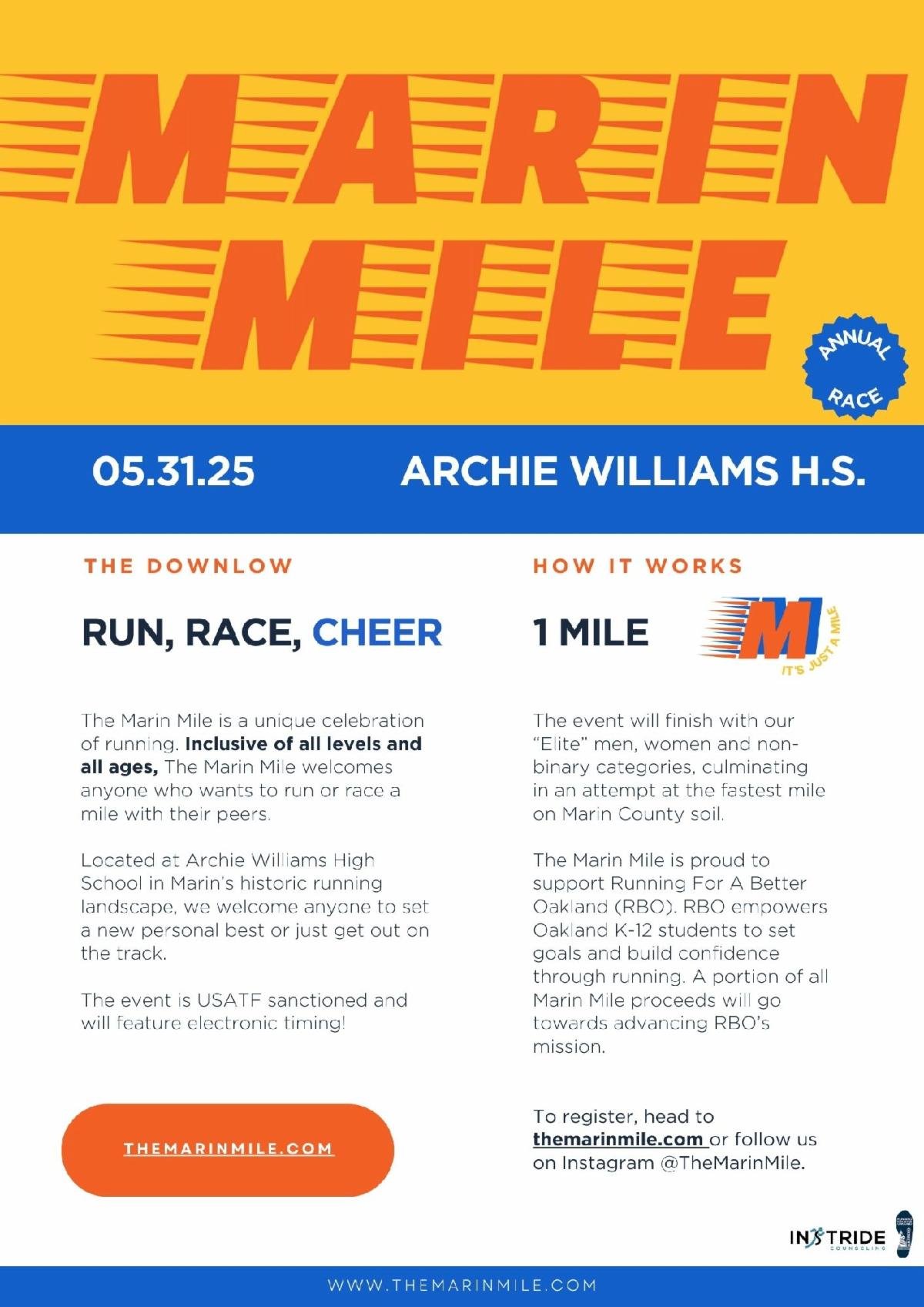 Marin is home to a rich and storied history of running. After our inaugural race in 2024, we are psyched to bring you the second edition of the Marin Mile. This event is for everyone— whether you want to jog, run, or race a mile on a historic local track!