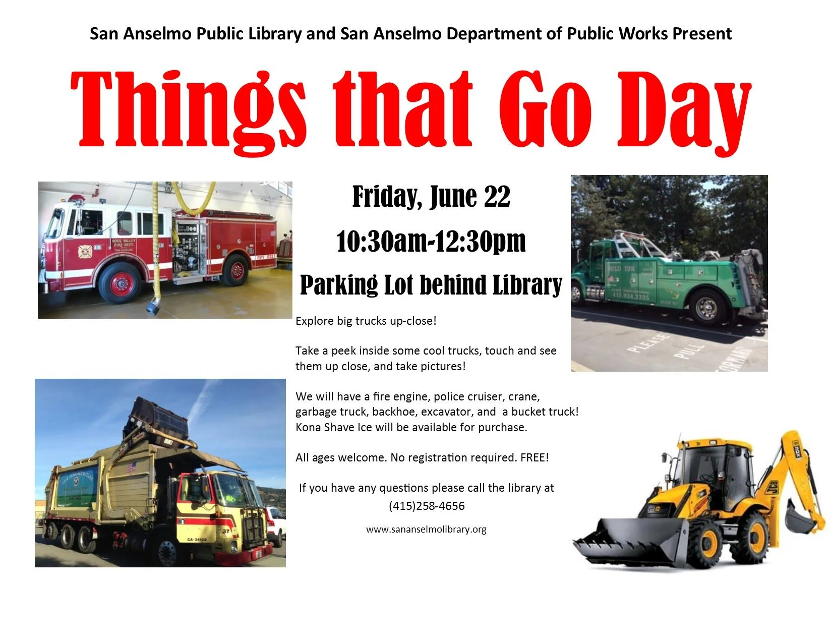 Friday, June 22 10:30am-12:30pm Parking Lot behind Library Explore big trucks up-close! Take a peek inside some cool trucks, touch and see them up close, and take pictures! We will have a fire engine, police cruiser, crane, garbage truck, backhoe, excavator, and a bucket truck! All ages welcome. No registration required. FREE! If you have any questions please call the library at 415)258-4656
