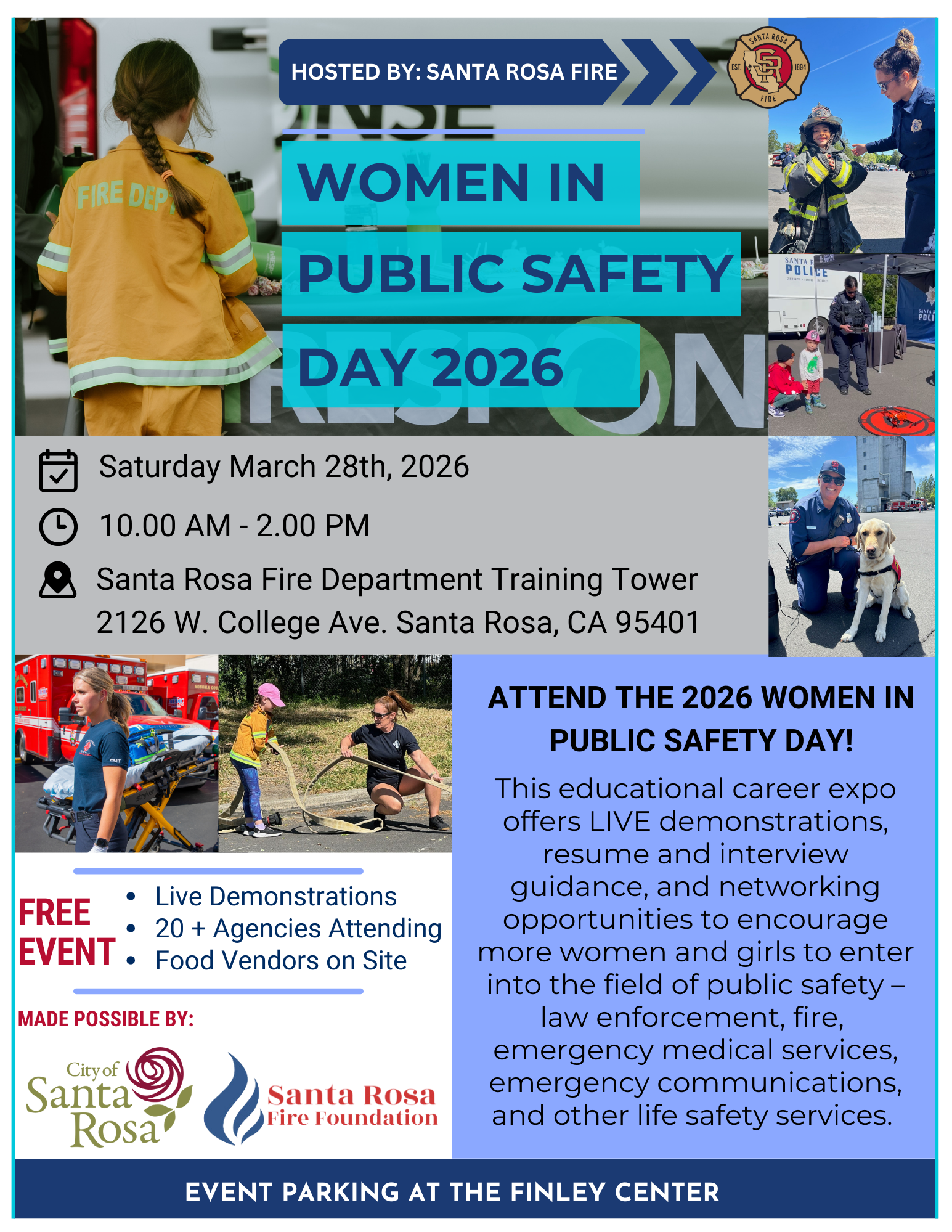 The Santa Rosa Fire Department (SRFD) invites all to attend the 5th Annual Women in Public Safety Day on Sat., March 28th, 10 a.m. – 2 p.m. at SRFD’s Training Tower located 2126 W. College Avenue in Santa Rosa, CA with event parking at the Finley Center. This event will inspire women and girls to pursue careers in public safety as they interact with women working in law enforcement, fire, emergency medical services, and other life safety services.