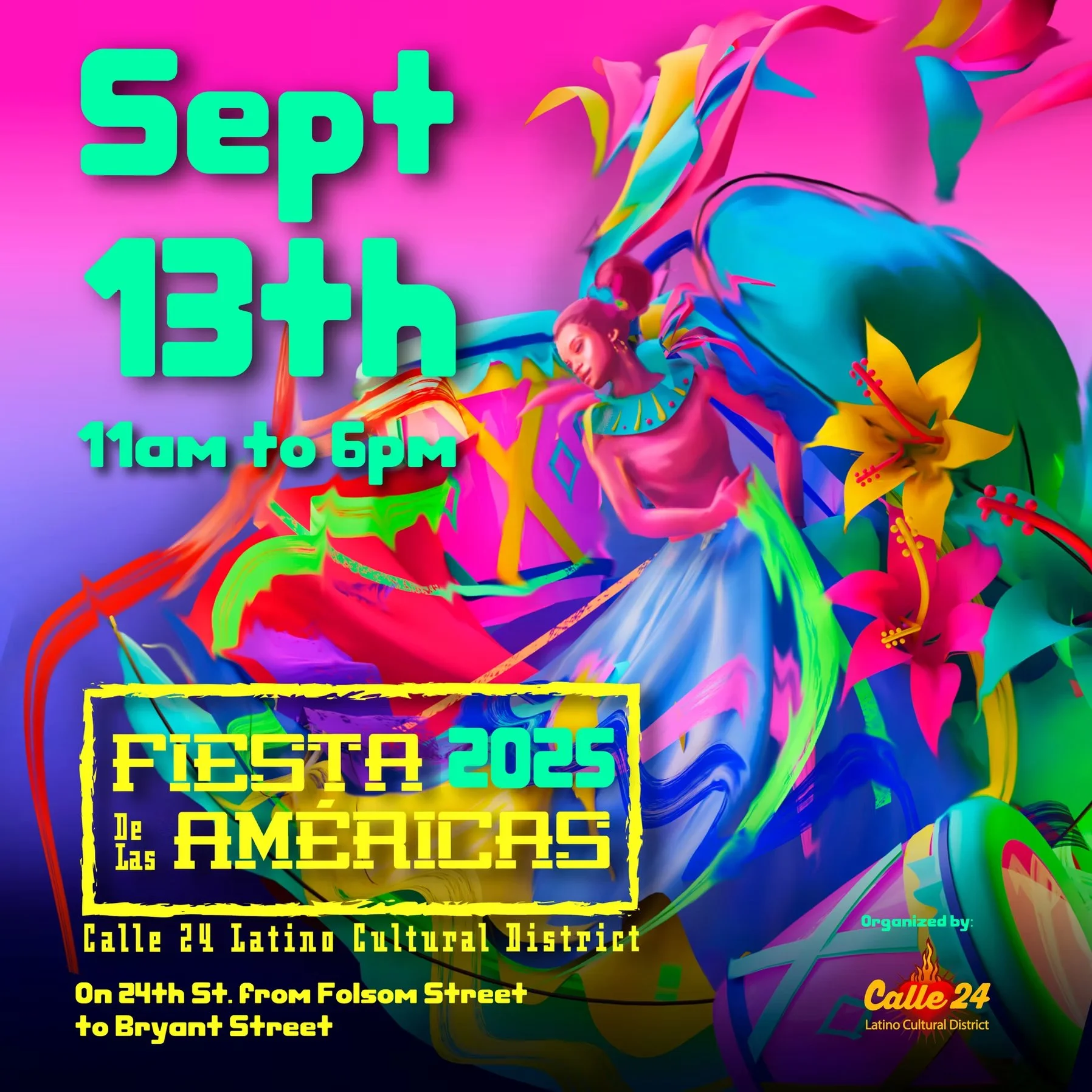 The Calle 24 Latino Cultural District is proud to host the 2025 Fiesta de las Américas on Saturday, September 13 from 11 AM to 6 PM, right in the heart of the Mission — along 24th Street from Bryant to Folsom. Fiesta de las Américas is a free, family-friendly celebration honoring our unique cultures, arts, and music that span from Patagonia to the Arctic Circle, with a special focus on the Latino diaspora that has called San Francisco home for generations. We're calling on: Local vendors and artists to showcase and sell their handmade goods Nonprofits and local businesses to come connect with the community Stay tuned — the vendor application is coming soon! Join us for a day filled with color, culture, and community!