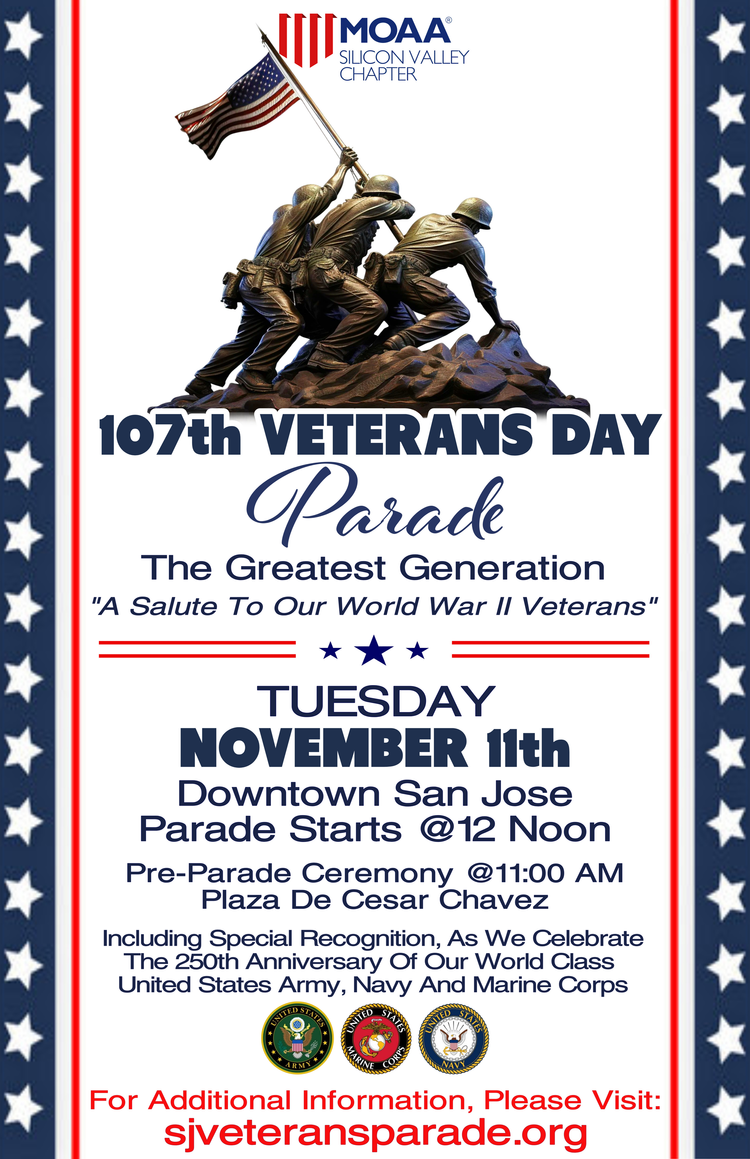 Each year, since 1919, the Veterans Day Parade has been produced with support from the City of San Jose, Santa Clara County, and contributions from many individuals and organizations.